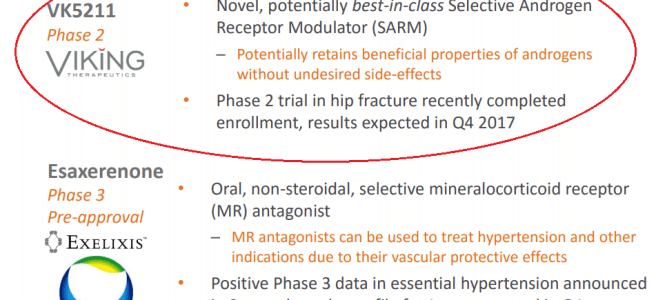 1. Viking’s lead candidate—a molecule known as VK5211–is a potent SARM that has been used as a black-market performance enhancement drug (PED) by athletes and bodybuilders. It is now being positioned clinically as a potential best-in-class treatment for a wide assortment of acute and chronic muscle and bone loss.